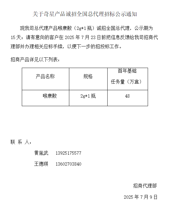 關(guān)于奇星產(chǎn)品誠招全國總代理招標(biāo)公示通知